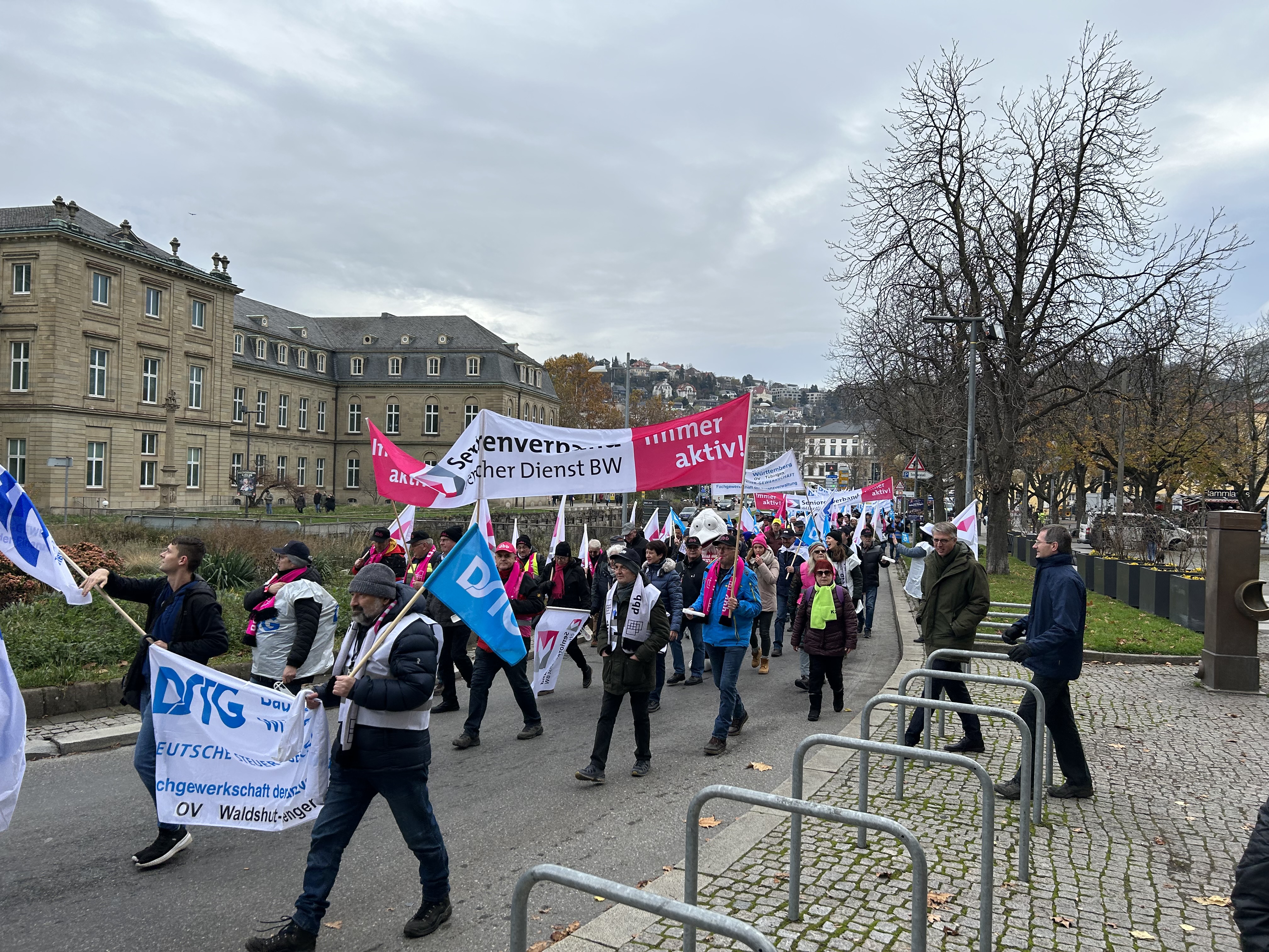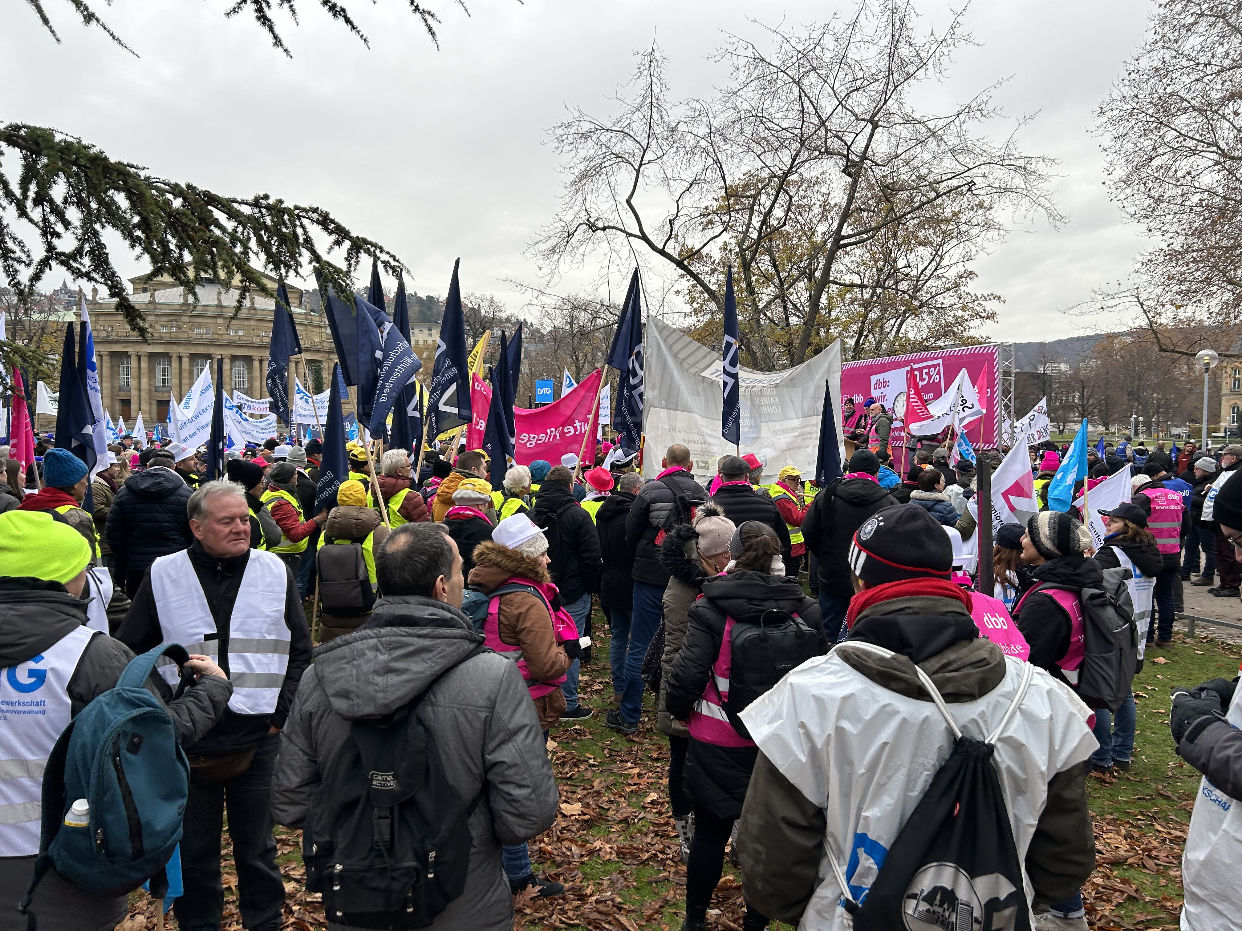 Der zeitliche Ablauf der Stuttgarter Protestveranstaltung ist so gewählt, dass auch Beamtinnen und Beamte aus dem Land und den Kommunen bzw. alle Kolleginnen und Kollegen aus den nicht o. g. Tarifbereichen in einer verlängerten Mittagspause (oder Freizeit) solidarisch daran teilnehmen können.